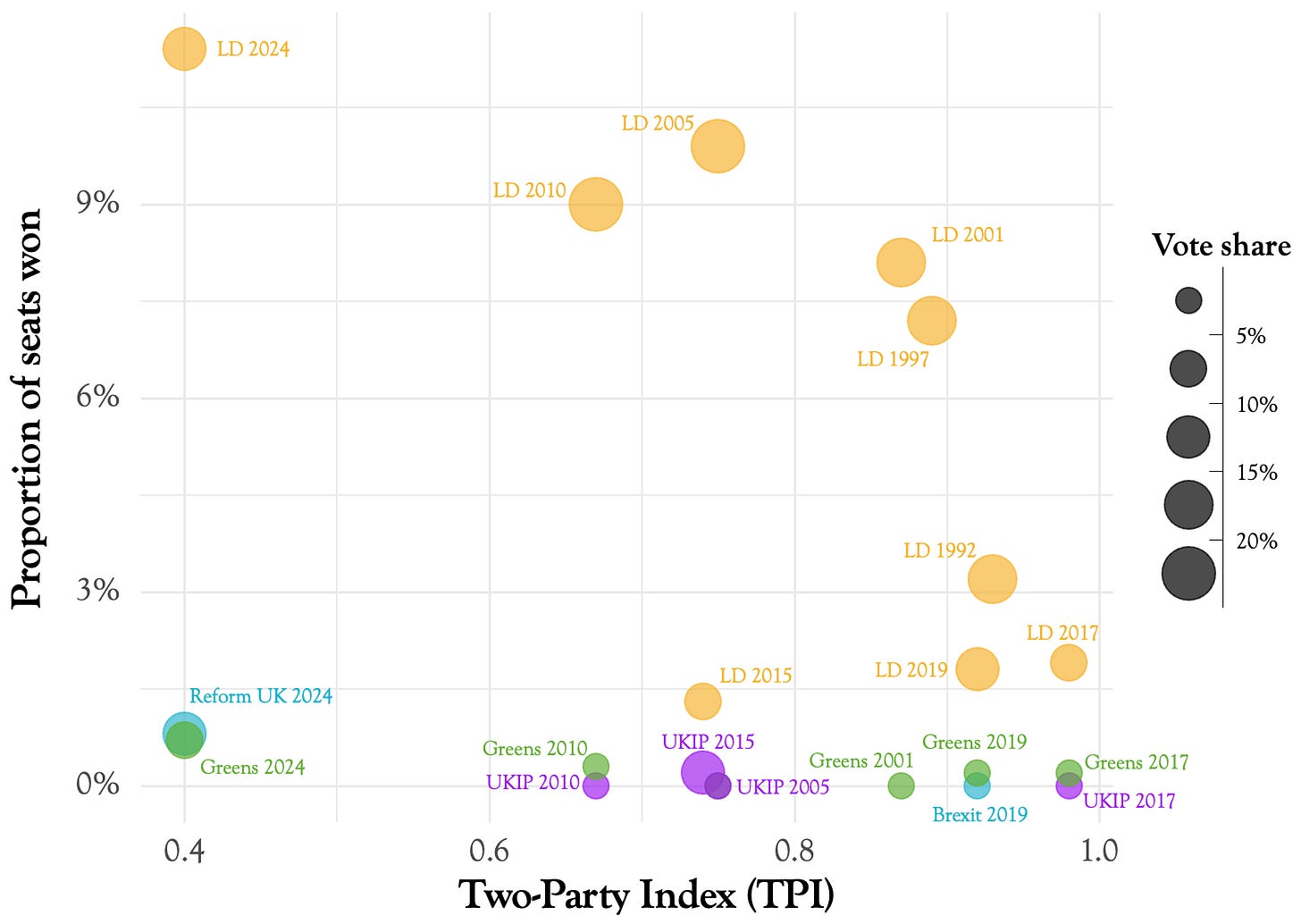 Quantifying this is a little tricky — pinning down the exact national vote share threshold is hard as I discovered on my train journey. But the graphic below give you an idea. The Two Party Index is a function I defined here and tells us how close Britain is to a two-party state. The filter is essentially a function of this, with larger TPIs leading to large barriers to entry. For example, in 2024 the barrier was very low and thus three smaller parties managed to pick up seats, whereas in 2017 the barrier was very high and hence the Liberal Democrats and Greens did worse.
